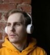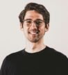 A hand holds a black business card with white text reading 'FORTY TWO Strategy Innovation Design' against a blurred urban skyline backdrop. The sky is clear and blue, suggesting a bright day.